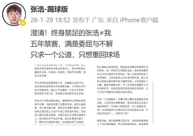 张浩表示:“我非常不认可足协说的这些话,因为我认为一名足球运动员,任何一个项目的运动员,只要上场比赛就应该全力以赴。我也不认可足协说的这场比赛无关紧要,我不需要全力的去踢比赛这种屁话。”