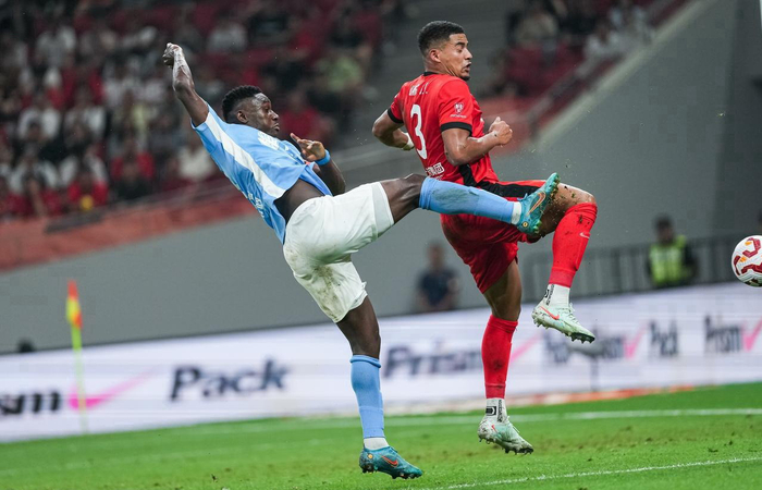 大连英博前锋马莱莱对抗上海海港归化国脚蒋光太。