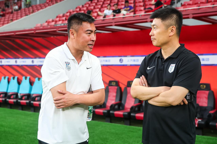 赛前,投资人王魁与一线队主帅李国旭在一起交流。加上俱乐部总经理,三人组成了被称为三驾马车的大连英博管理团队。经过两个赛季的磨合,三位出生于1978年的同龄人在性格上互补,配合十分默契,带领大连英博完成冲超和中超保级,让足球城球迷看到了大连足球复兴的希望。