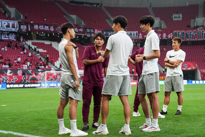 赛前,大连英博小将毛伟杰、黄山、朱鹏宇与国青队友的蒯纪闻热聊,旁边还能看到同样是U21球员的赵佳楠。