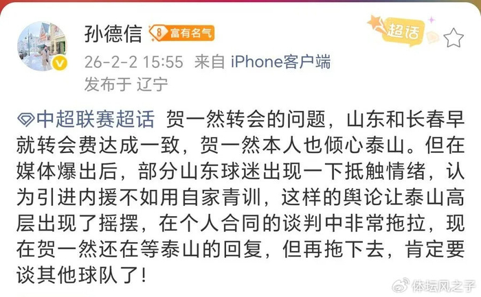 然而,近期却传出不利消息。有博主称贺一然转会进程因山东球迷抵触情绪而拖沓,部分球迷认为,引进贺一然还不如培养自家青训球员,只要给足够多的机会,史松宸并不一定就比贺一然差,目前,泰山队在引援决策上似乎有些摇摆不定。一方面,球队后防线确实急需新鲜血液注入,贺一然的能力和潜力符合球队需求;另一方面,可能受到一些外部因素干扰,尤其是最近几个赛季泰山队产生了多笔失败的引援,舆论压力也是俱乐部高层不得不考虑的。