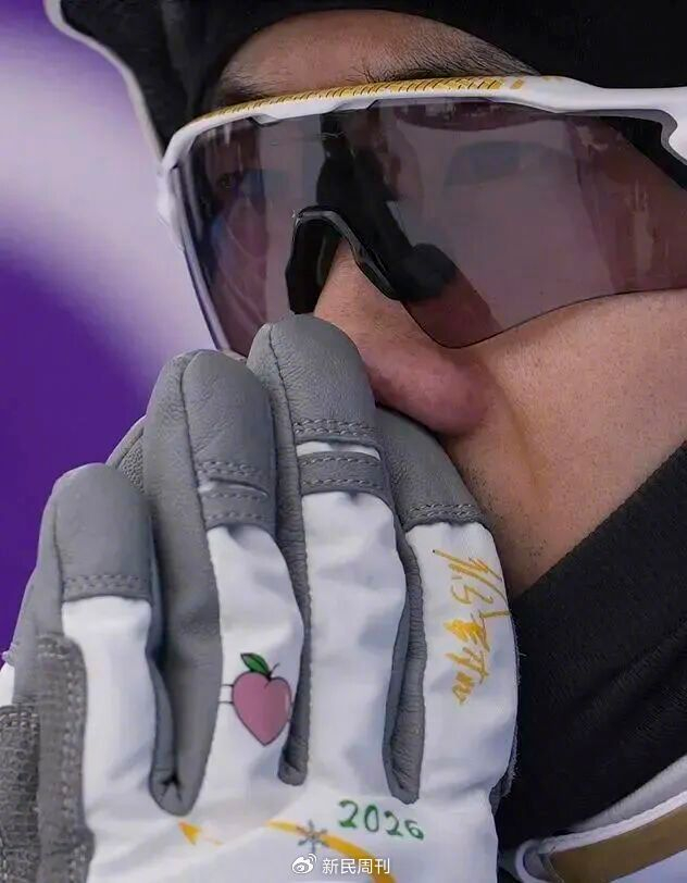 他们的浪漫,藏在赛场的每一个细节里,每一处都令人动容:王心迪的参赛手套上,一只绣着“桃”,一只绣着“心”,把对妻子的爱意,缝进每一次握杖、每一次起跳。