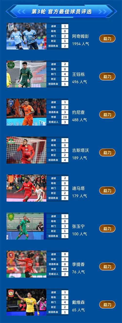 中超官方24日公布了第三轮最佳球员候选名单,阿奇姆彭上榜。英博与海港一战中,阿奇姆彭攻入关键进球,帮助球队掀翻卫冕冠军,取得赛季首胜。斯坦丘则以12421米位列跑动榜次席。