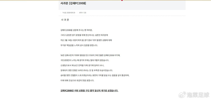 如果说新赛季K联赛开赛后哪支球队最“倒霉”,金海FC2008恐怕当仁不让。这支本赛季雄心勃勃进军职业联赛的新军,不仅遭遇K2联赛开局四连败,还因管理层赛后的不当言行,领到了新赛季的首张罚单。在本月召开的第一次赏罚委员会上,针对14日主场对阵水原FC的K2联赛第三轮比赛结束后,俱乐部经理孙炳哲对离场裁判进行辱骂的行为,联盟决定对金海FC处以1000万韩元的罚款。据悉,孙炳哲的不满源于对补时判罚的争议,他认为规定补时时间已到,裁判却酌情延长了比赛,最终导致球队被对手读秒绝杀。